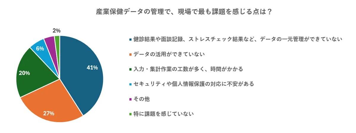 多くの産業保健スタッフが最も課題として感じているのは、データの分散や管理の煩雑さです。