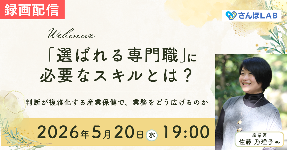本セミナーは、2026年3月11日(水)に実施したセミナーのアーカイブ配信です。産業保健職が自分の業務をどのように広げていくのかに焦点を当て、『現場で“考え抜く力”』の原理・原則を理解します。判断の軸を整理することで専門性の幅を広げ、今後のキャリアアップにつなげることを目指します。