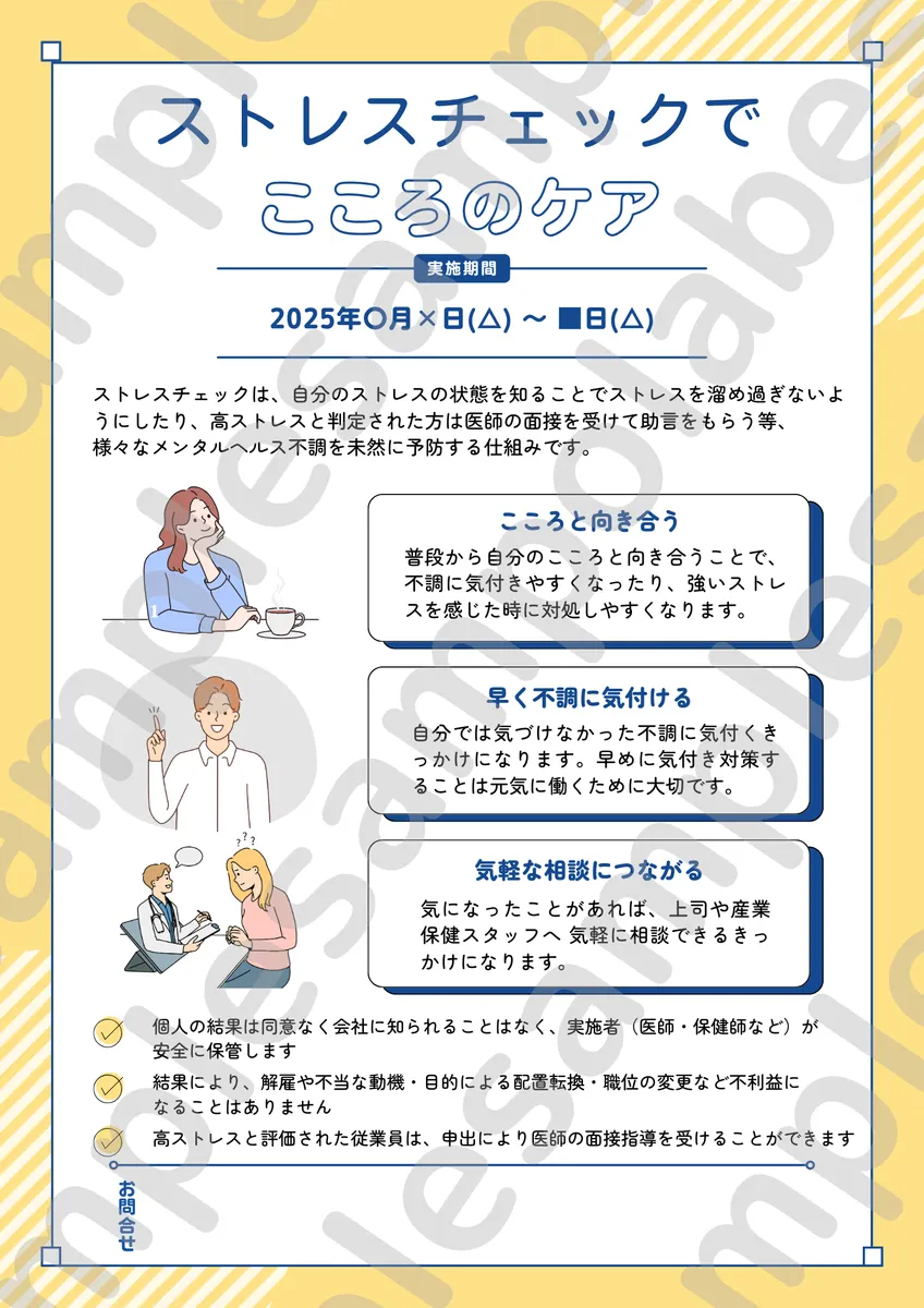 ストレスチェック案内用のポスターをご用意しました。メールへの添付や社内掲示などにご活用ください。PowerPoint形式ですので、内容やデザインを自由に編集してご利用いただけます。