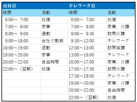 | 40代の男性会社員Aさんは、平日フル出社の勤務形態。脳梗塞で麻痺が残った母親の在宅介護のため、週3日のテレワークを申請しました。 出社日には訪問介護を入れ、テレワーク日には自身が対応することで、母親も安心して在宅生活を続けられ、Aさんも離職せずに仕事を両立できました。 Aさんは片道1時間(往復2時間)の通勤時間が削減されたことで、その時間を母親のケアや家事に充てることができるようになり、精神的な負担も大幅に軽減されました。 |