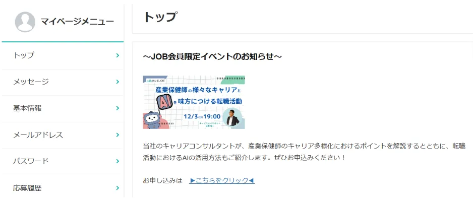 ➁マイページにある、「~JOB会員限定イベントのお知らせ~」にある<お申し込みは▶こちらをクリック◀>より、お申込みフォームを入力する。