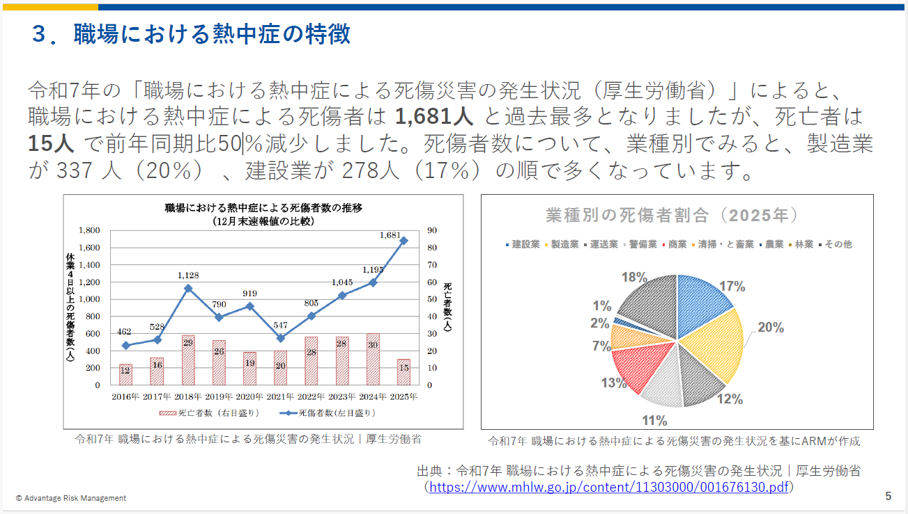 今回、熱中症対策における講話資料をリニューアルしました。体制づくりや職場における注意点などすぐ活かせる内容を整理しています。