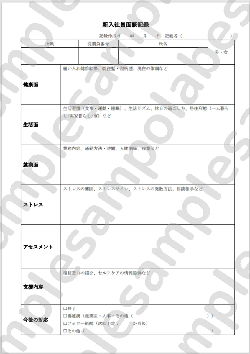 さんぽLABでは、産業保健スタッフが実施する新入社員面談に活用できる記録フォーマットをご用意しました。