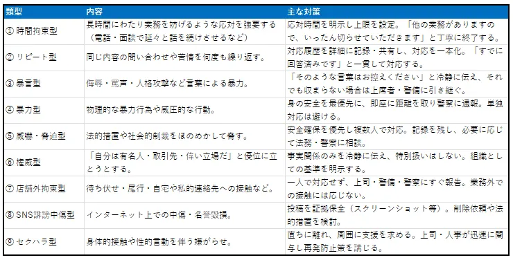 カスタマーハラスメントには、時間拘束型や暴言型など、主に9つの類型があります。それぞれに応じた対応をとることで、従業員の安全と尊厳を守ることができます。