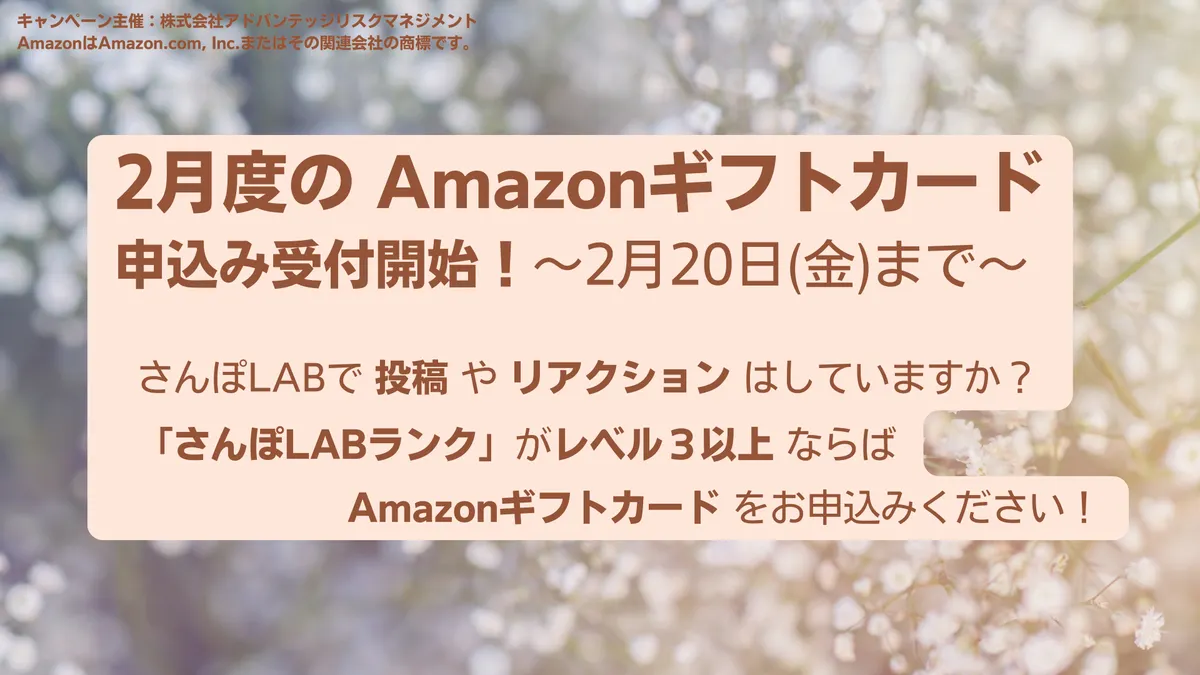 さんぽLABでは皆様に投稿やリアクションがあることで、現場で必要とされる情報が集まり、多くの方に関心を持っていただけき、さらに投稿が増えるといった好循環が生まれると考えています。些細なことでも結構ですので「いいね」や「お困りごとQ&A」でリアクションをいただけると嬉しいです。ランク3以降は、ランクが1上がるごとにささやかながらAmazonギフトカード1,000円分をお送りさせていただきます。ご自身のランクをご確認いただき、お申込みいただければと存じます。