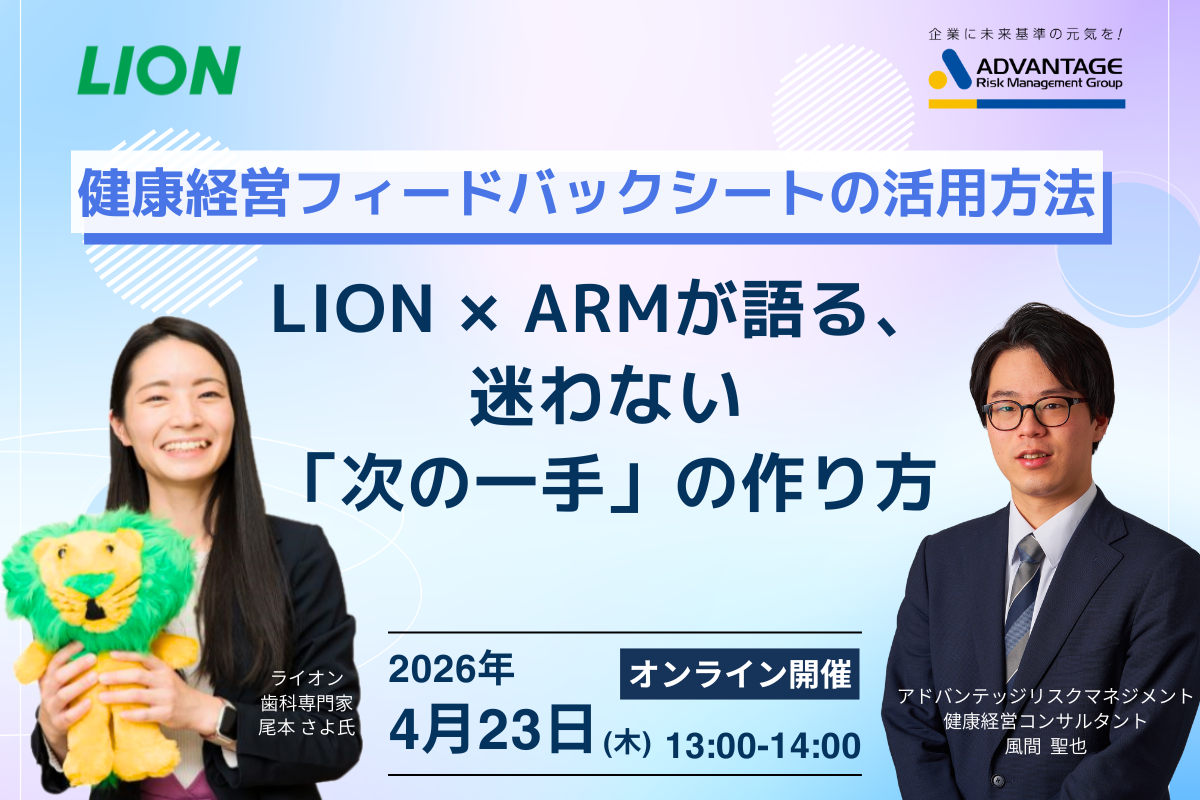 本セミナーは、さんぽLABの運営元である株式会社アドバンテッジリスクマネジメントとライオン株式会社の共催により、健康経営度調査における調査票ポイントのおさらいを行うとともに、健康経営度調査フィードバックシートを活用した振り返りの進め方、各種健康データの分析・活用方法、今後に向けたメンタル・フィジカル両面からの新たな取り組み例をご紹介します。
