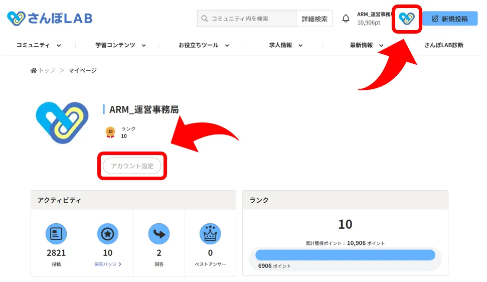 ①マイページから「アカウント設定」をクリックします。