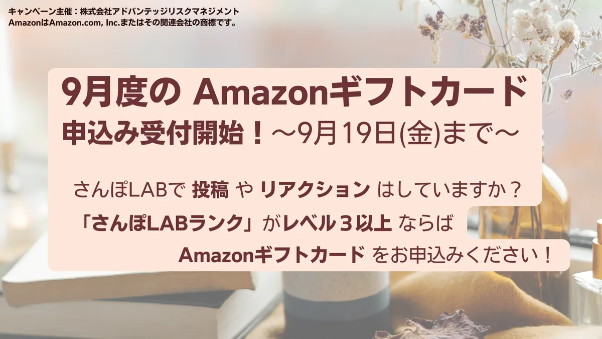 さんぽLABでは皆様に投稿やリアクションがあることで、現場で必要とされる情報が集まり、多くの方に関心を持っていただけき、さらに投稿が増えるといった好循環が生まれると考えています。些細なことでも結構ですので「いいね」や「お困りごとQ&A」でリアクションをいただけると嬉しいです。ランク3以降は、ランクが1上がるごとにささやかながらAmazonギフトカード1,000円分をお送りさせていただきます。ご自身のランクをご確認いただき、お申込みいただければと存じます。