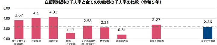 厚生労働省の発表によると、外国人労働者の労災による死傷者数は5,672人にのぼり、前年から864人の増加となっています。 全労働者の死傷年千人率(労働災害による死傷者数/平均労働者数×1,000)は2.36であるのに対し、外国人労働者のみでは2.77と、明らかに高い傾向があります。 特に技能実習生1(4.10)や特定技能労働者2(4.31)については、全体の約1.7~1.8倍高く、ハイリスク群と言えます。