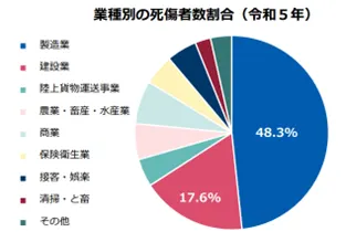 また、業種別では製造業(48.3%)、建設業(17.6%)が多く、職場の危険性が高い分野での事故が多発している点が特徴です。