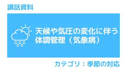 天候や気圧の変化に伴う体調管理とは。気象病や天気痛と呼ばれる症状、その対処方法について詳しく解説。 運動など、日頃の体調管理を行うことで、その症状とうまく付き合っていくことが重要です。今回は、天候や気圧の変化に伴う体調管理について解説します。PDF資料より抜粋CONTENTS / 9 ページはじめに天候や気圧の変動に伴い起こる症状はさまざま気圧、温度、湿度の変化が影響していると考えられている症状を