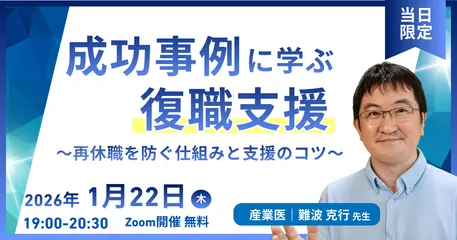 ★アーカイブなし★【1/22 Web開催】成功事例に学ぶ復職支援~再休職を防ぐ仕組みと支援のコツ~ こんな方にお勧め✓ 復職判断や復職支援の進め方に迷いがある✓ 再休職が続き、対応の見直しが必要だと感じている方✓ 段階的復職(リハビリ勤務)や業務調整の進め方を整理したい✓ 復職後の定着支援やフォローアップに課題感を持つ方復職支援に携わる中で、復職判断の迷いや、再休職が続いてしまうケースへの対応に悩